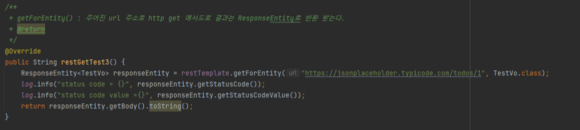 - getForEntity() : ์ฃผ์ด์ง URL ์ฃผ์๋ก HTTP GET ๋ฉ์๋๋ก ๊ฒฐ๊ณผ๋ ResponseEntity๋ก ๋ฐํ๋ฐ๋๋ค.