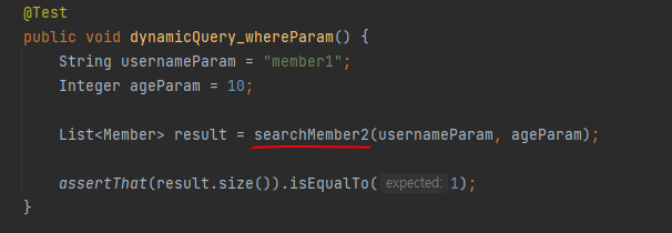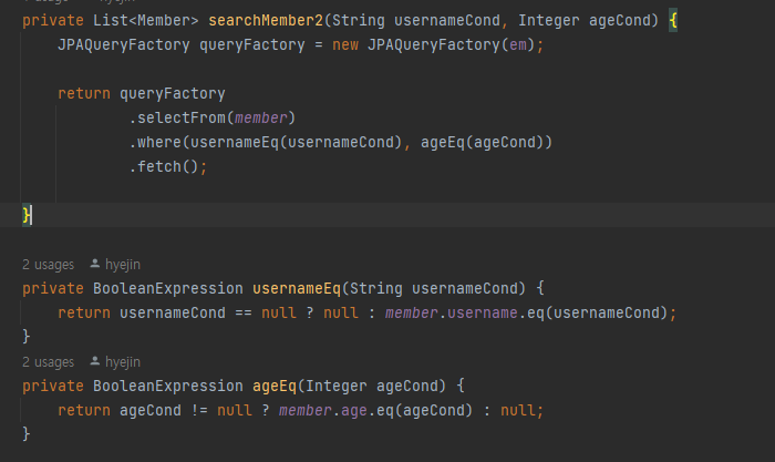 ๊ฑฐ๊ธฐ์ usernameCond์ ageCond์ null ์ฒดํฌํ ์ด๊ฑธ where ํ๋ผ๋ฏธํฐ๋ก ,๋ก ์ฐ๊ฒฐํด์ฃผ๋ ๊ฒ์ด๋ค.