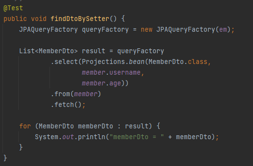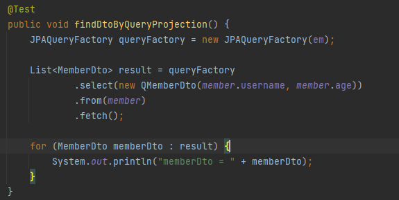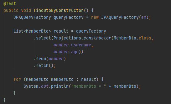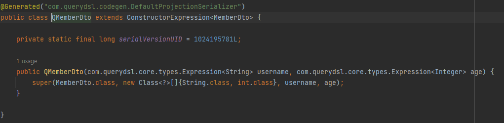 -> MemberDto ์์ฑ์์ @QueryProjection ์ด๋ ธํ ์ด์ ์ ๋ถ์ฌ์ค๋ค.