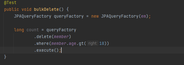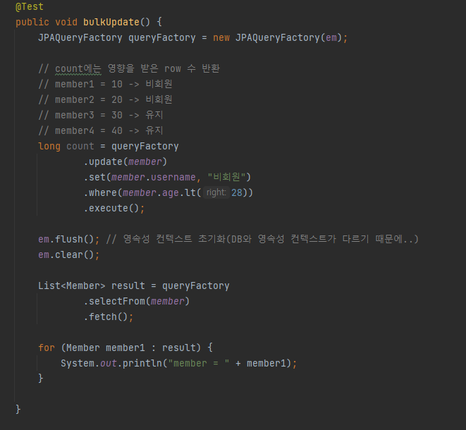 JPQL ๋ฐฐ์น์ ๋ง์ฐฌ๊ฐ์ง๋ก ์์์ฑ ์ปจํ ์คํธ์ ์๋ ์ํฐํฐ๋ฅผ ๋ฌด์ํ๊ณ ์คํ๋๊ธฐ ๋๋ฌธ์ ๋ฐฐ์น ์ฟผ๋ฆฌ๋ฅผ ์คํํ๊ณ ๋๋ฉด ์์์ฑ ์ปจํ ์คํธ๋ฅผ ์ด๊ธฐํํ๋ ๊ฒ์ด ์์ ํ๋ค.