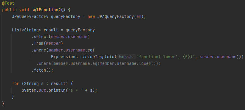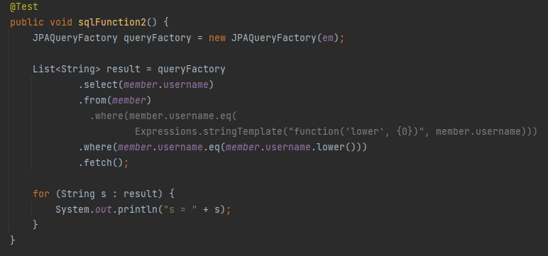 ๋ฐ๋ผ์ where(member.username.eq(member.username.lower()) ์ด๋ ๊ฒ ์ฒ๋ฆฌํด๋ ๊ฒฐ๊ณผ๋ ๊ฐ๋ค.