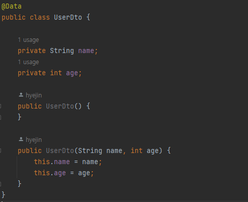 ์ด๋ฒ์๋ UserDto๋ฅผ ๋ง๋ค์ด์ ํ์ ์ด๋ฆ์ username์ด ์๋ name์ด๋ผ๊ณ ๊ฐ์ ํด๋ณด์.
