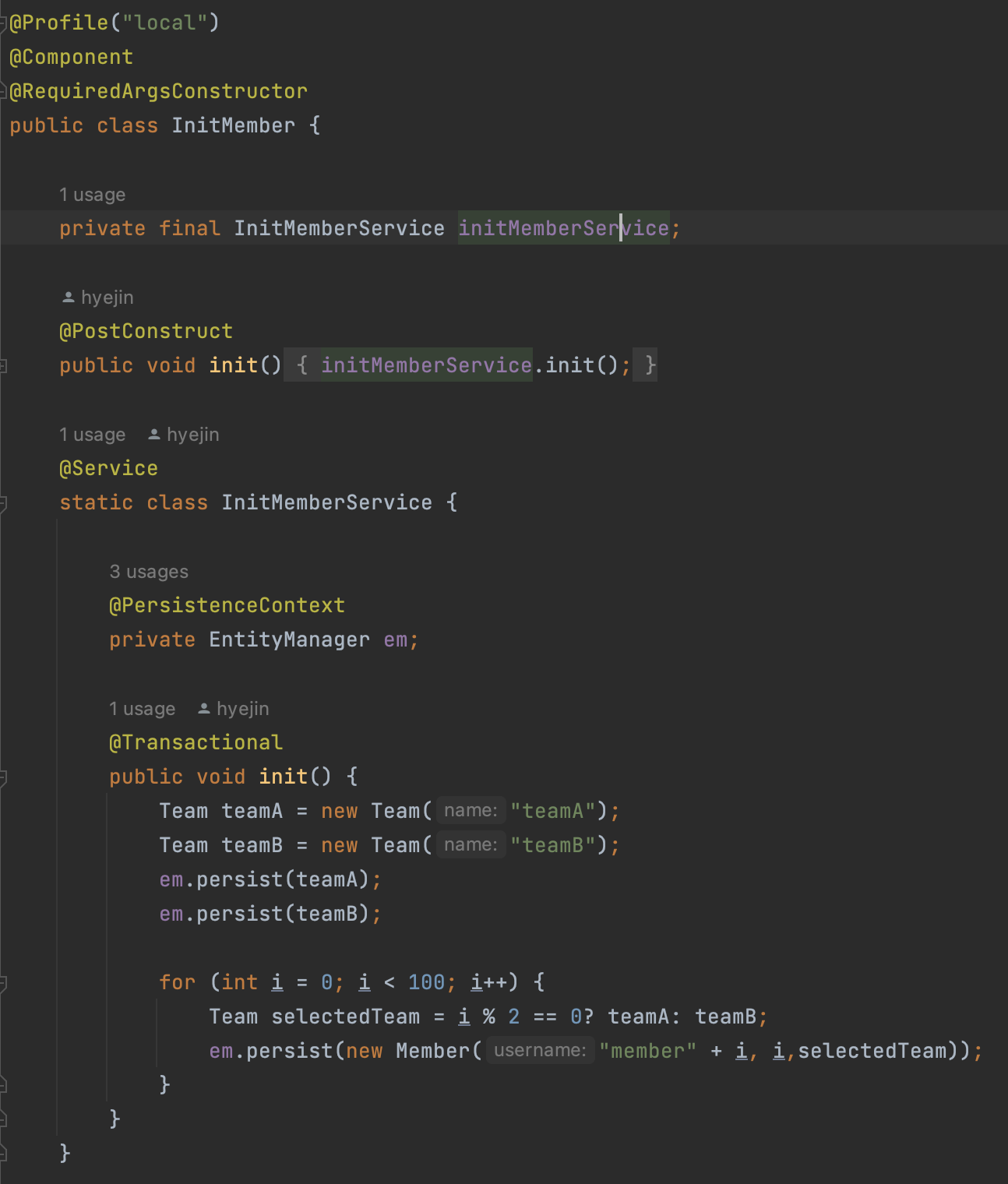 InitMember ํด๋์ค์์ ๋ด๋ถ์ InitMemberService๋ฅผ ๋ง๋ค์ด์ Team๊ณผ Member ๋ฅผ ๋ง๋ค์ด์ค๋ค.