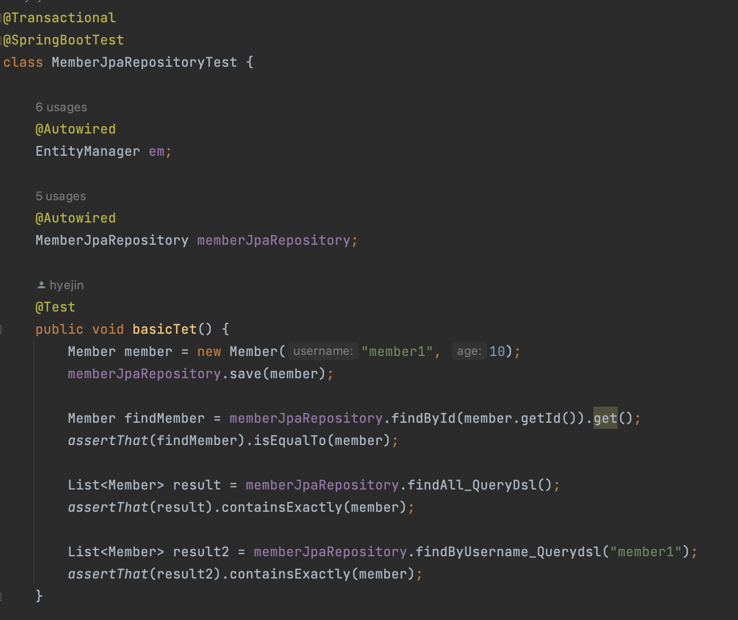 ์์์ ํ๋ ํ ์คํธ์์ findAll() ์ findAll_Querydsl()๋ก, findByUsername()์ findByUsername_Querydsl()๋ก ๋ณํํด์ ํ ์คํธ๋ง ์งํํด์ฃผ๋ฉด ๋๋ค. (์ด์ฐจํผ ๊ฐ์ ๊ธฐ๋ฅ์ ํ๊ธฐ ๋๋ฌธ)