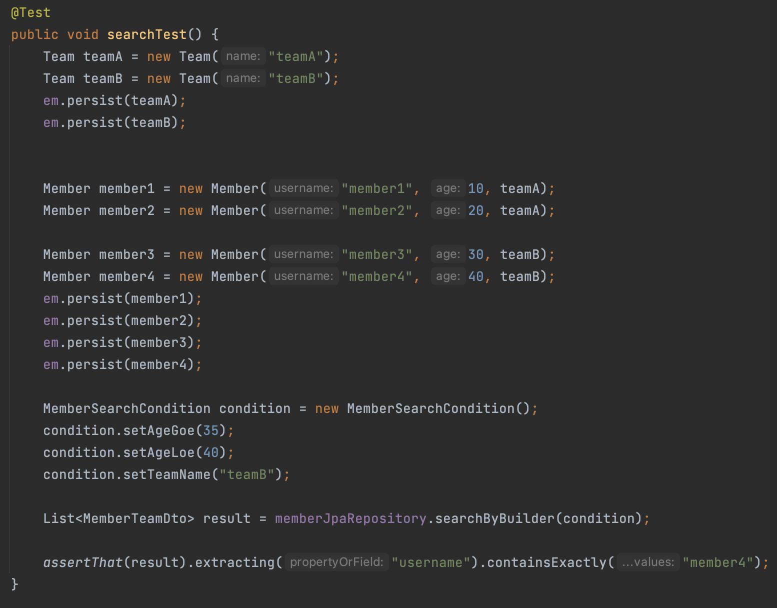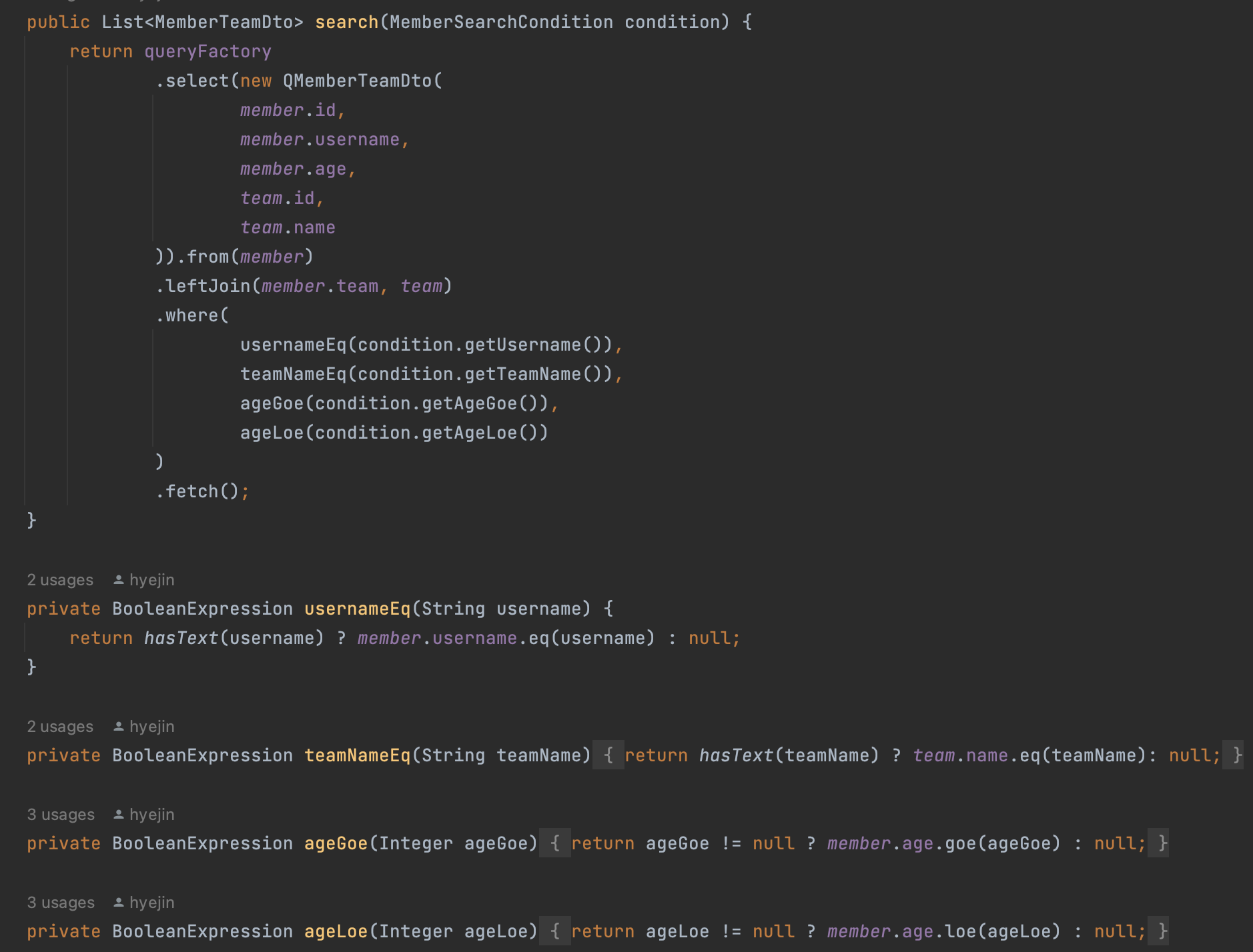 usernameEq, teamNameEq, ageGoe, ageLoe ๋ฉ์๋๋ฅผ ๋ฐ๋ก ๋นผ์ ์กฐ๊ฑด์ผ๋ก ์ถ๊ฐํด์คฌ๋ค.