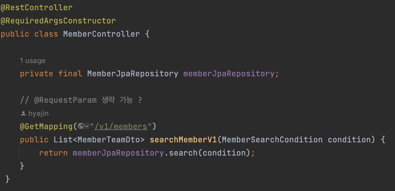 ์ฌ๊ธฐ์๋ ๊ทธ๋ฅ ๊ฐ๋จํ MemberSearchCondition๋ง ํ๋ผ๋ฏธํฐ๋ก ์ ๋ฌํด์ฃผ๋ฉด ๋๋ค.