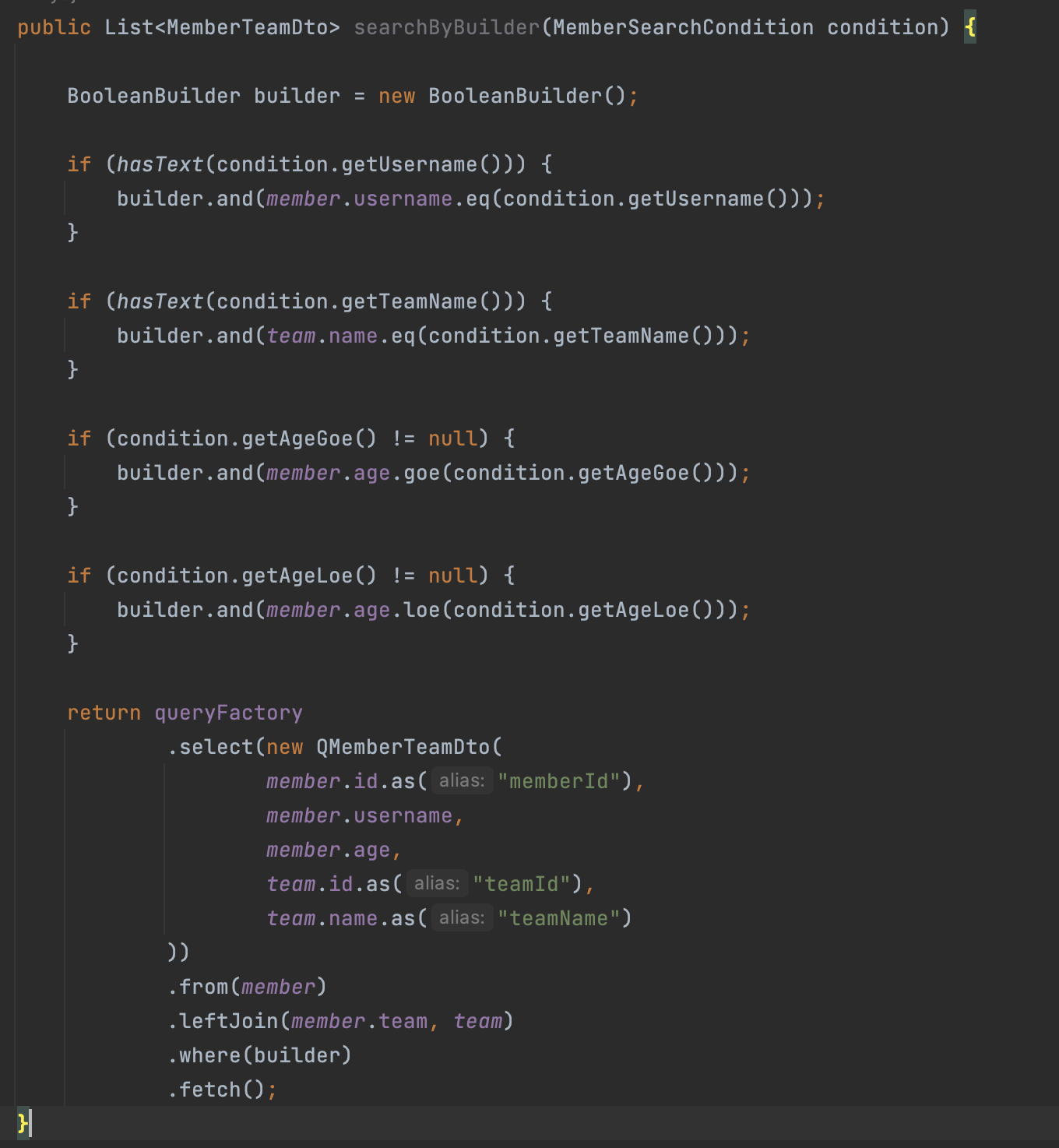 ๋์ ์ฟผ๋ฆฌ๋ฅผ ์์ฑํ builder ์ ๋ํด์๋ where ์กฐ๊ฑด์ builder๋ฅผ ์ถ๊ฐํด์ฃผ๊ธฐ๋ง ํ๋ฉด ๋๋ค.