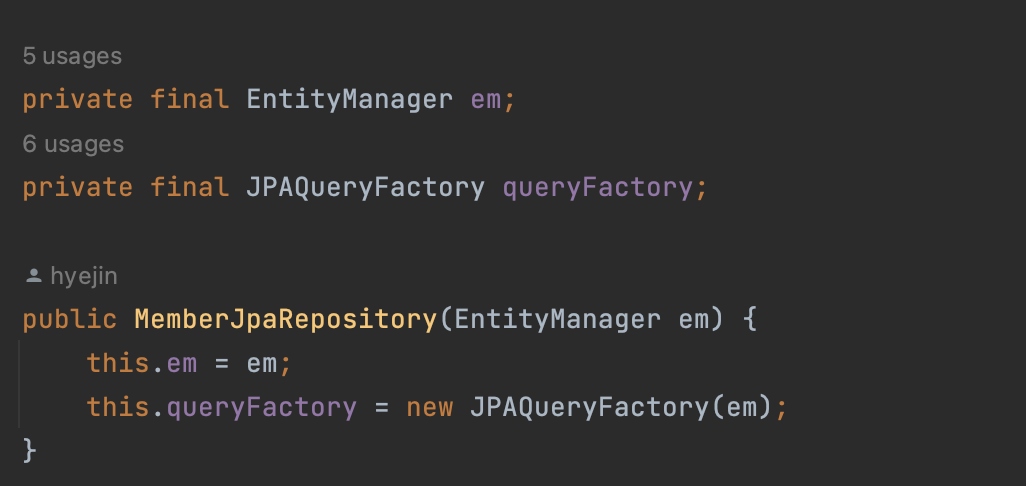 ์ด๋ฐ์์ผ๋ก ์์ฑ์์์ JpaQueryFactory๋ฅผ ์๋ก ์์ฑํด์ EntityManagrer๋ฅผ ์ฃผ์ ํด์ ์ฌ์ฉํ๋ ๋ฐฉ์์ ์ฌ์ฉํ๊ณ ์๋ค.