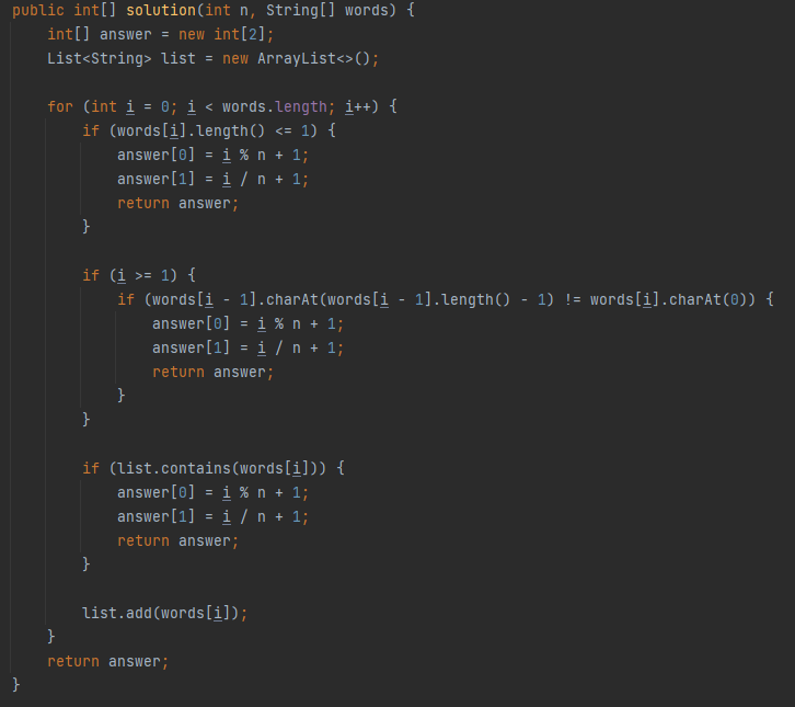 μ¬λμ μ nκ³Ό μ¬λλ€μ΄ μμλλ‘ λ§ν λ¨μ΄ words κ° λ§€κ°λ³μλ‘ μ£Όμ΄μ§ λ, κ°μ₯ λ¨Όμ νλ½νλ μ¬λμ λ²νΈμ κ·Έ μ¬λμ΄ μμ μ λͺ λ²μ§Έ μ°¨λ‘μ νλ½νλμ§λ₯Ό ꡬν΄μ return νλλ‘ solution ν¨μλ₯Ό μμ±ν΄μ£ΌμΈμ.