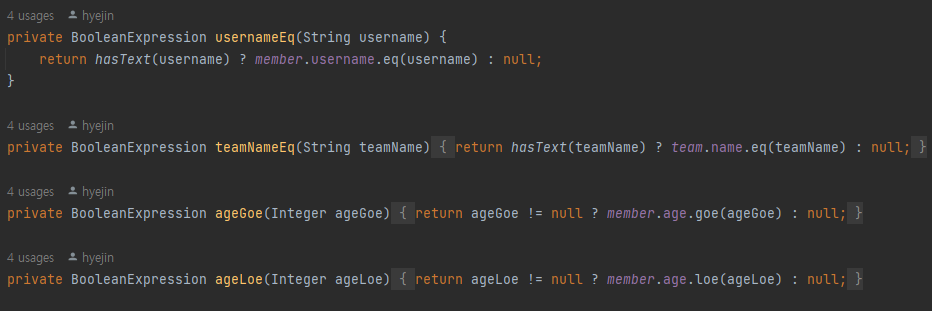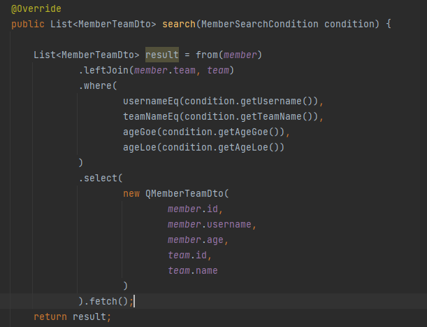 memberRepository.findAll(member.age.between(10, 40).and(member.username.eq("member1"));