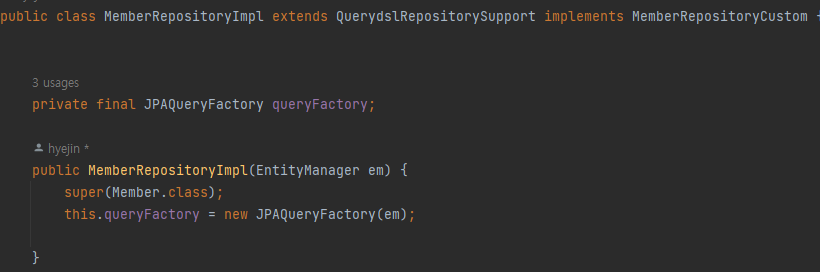QuerydslRepositorySupprot๊ฐ QueryFactory๋ฅผ ์ฌ์ฉํ์ง ์๊ธฐ ๋๋ฌธ์ ์ด๋ฅผ ๋ง์ถ๊ธฐ ์ํด์ ๊ฐ์ฌ๋์ด ์ง์ ๋ง๋ ๊ฒ์ผ๋ก