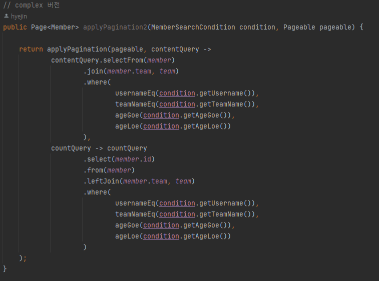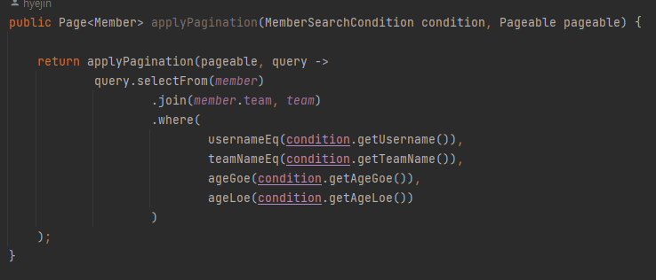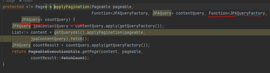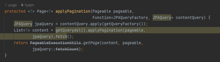 getQuerydsl().applyPagination()์ ํ์ด์ง๊ณผ ์ฟผ๋ฆฌ๋ฅผ ํ๋ผ๋ฏธํฐ๋ก ์ฃผ๋ฉด ๋๋ค.