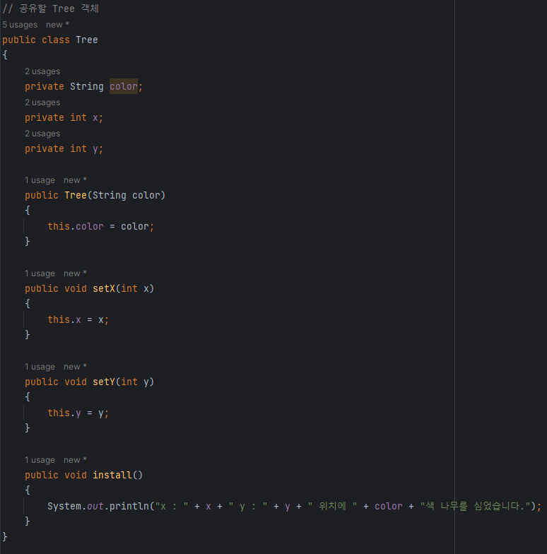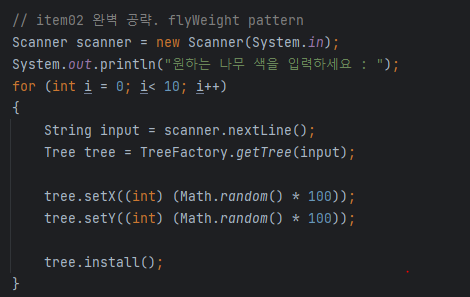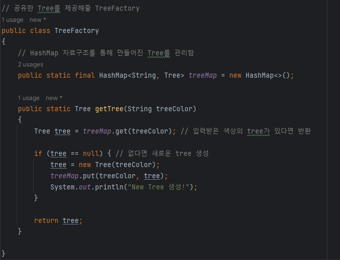 flyweight pattern์ ๋๋ฌด์ ์๊น์ด ๋ฐ๋ ๋ ์๋ก์ด ๊ฐ์ฒด๋ฅผ ์์ฑํด์ ์ฆ, ๋๋ฌด ์ ๋ณ๋ก ํ๋์ ๋๋ฌด ๊ฐ์ฒด๊ฐ ์๊ฒจ ์ฌ๋ฌ๊ฐ์ ๋๋ฌด๊ฐ ์๊ธฐ๋๋ฐ,