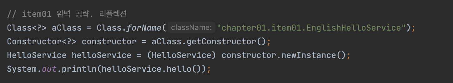 getConstructor() λ₯Ό ν΅ν΄ μμ±μλ₯Ό μ»μ΄μ€κ³ , newInstance() λ₯Ό ν΅ν΄ HelloService μΈμ€ν΄μ€λ₯Ό λμ μΌλ‘ μμ±ν΄μ€ μ μλ€.