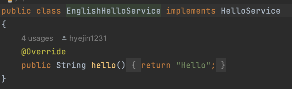HelloServiceλΌλ μΈν°νμ΄μ€λ₯Ό ꡬνν EnglishServiceλΌλ ν΄λμ€λ₯Ό μμ±νκ³ , 리νλ μ μ μ¬μ©ν μμ μ΄λ€.