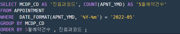 ๋จผ์ ๊ธฐ์ค์ MCDP_CD์ธ ์ง๋ฃ๊ณผ์ฝ๋๋ฅผ ๊ธฐ์ค์ผ๋ก ๊ทธ๋ฃนํํด์ผํ๊ณ , ๊ทธ๋ฆฌ๊ณ ์ง๋ฃ๊ณผ ์ฝ๋๋ณ 5์ ์์ฝ ๊ฑด์๋ฅผ ๊ตฌํด์ผ ํ๊ธฐ ๋๋ฌธ์ DATE_FORMAT์ ํ์ฉํด์ 5์ ๋ง์ผ๋ก ์กฐ๊ฑด์ ๊ฑธ๊ณ , COUNT๋ก 5์ ์์ฝ๊ฑด์๋ฅผ ๊ตฌํด์คฌ๋ค.