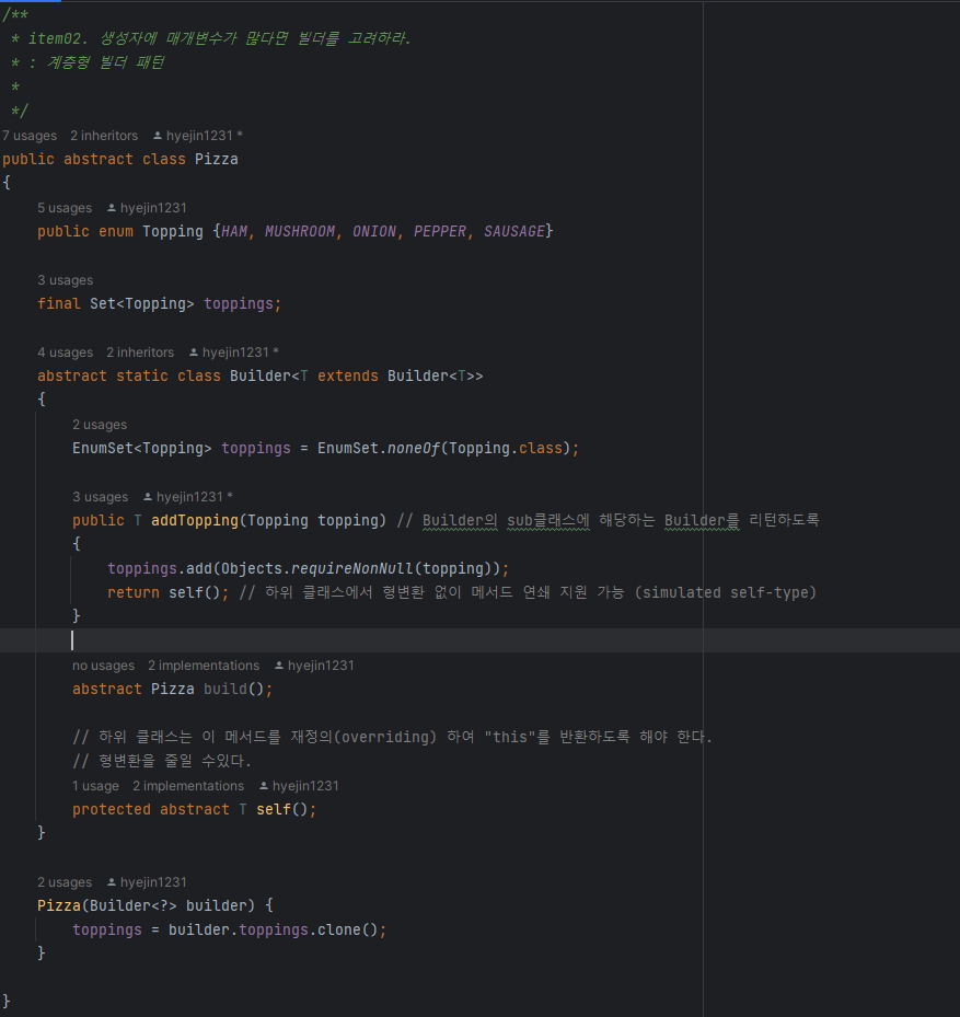 ๊ทธ๋ฆฌ๊ณ ์ด Pizza.Builder ํด๋์ค๋ ์ฌ๊ท์ ํ์ ํ์ ์ ์ด์ฉํ๋ ์ ๋ค๋ฆญ ํ์ ์ด๋ค.