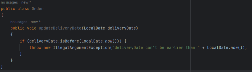 ์ด๋, deliveryDate๊ฐ ํ์ฌ๋ณด๋ค ์ ์ด๋ผ๋ฉด ๋ฐฐ์ก์ ๊ณผ๊ฑฐ๋ก ํ ์ ์๊ธฐ ๋๋ฌธ์ IllegalArgumnetException์ ํตํด ํ๋ผ๋ฏธํฐ๊ฐ ์๋ชป๋๋ค๊ณ ์๋ ค์ฃผ๊ธฐ ์ํด์ ์๋ฌ๋ฅผ ๋ฐ์์ํจ๋ค.